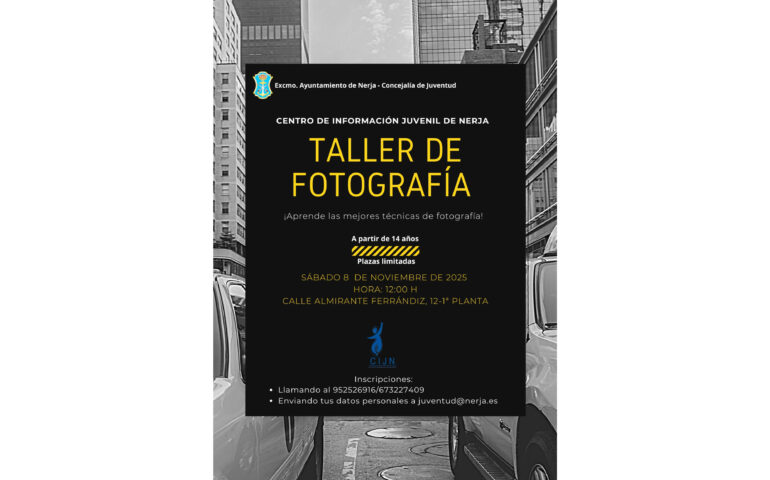 La Concejalía de Juventud del Ayuntamiento de Nerja organiza un Taller de Fotografía el próximo sábado 8 de noviembre a las 12:00 h, en el Centro de Información Juvenil de Nerja.